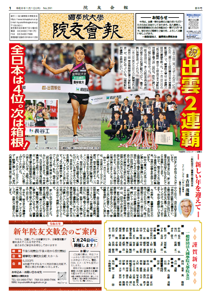 院友会報第391号(新年号)を発行いたしました。今号は会費・寄付金等のご協力をいただきました方のみにお送りさせていただきました。